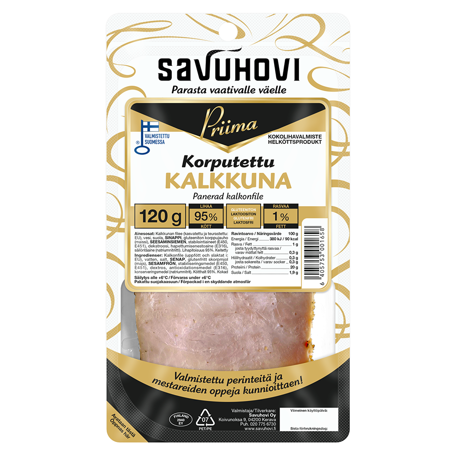 Kalkkunan filee (kasvatettu ja teurastettu: EU), vesi, suola, SINAPPI, gluteeniton korppujauho (maissi), SEESAMINSIEMEN, stabilointiaineet (E450, E451), dekstroosi, hapettumisenestoaine (E316), säilöntäaine (natriumnitriitti). Lihapitoisuus 95%. Keitetty